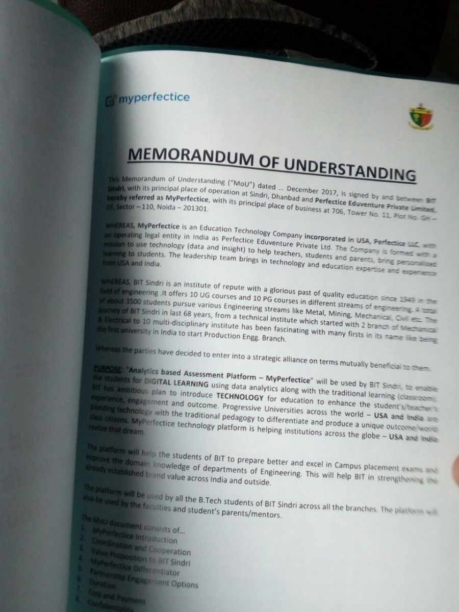 The Memorandum of Understanding is signed on 14th January, 2017 by and between BIT Sindri , Dhanbad and Perfectice Eduventure Private Limited , hereby referred as MyPerfectice .