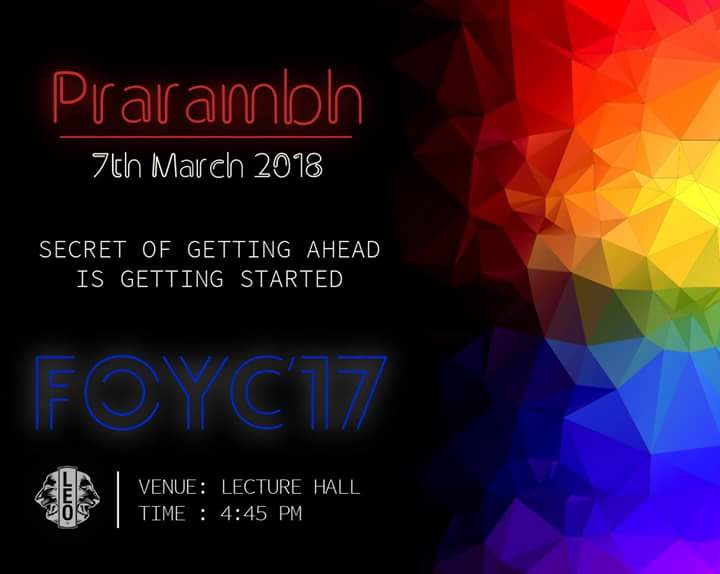 Prarambh, a pre-event which marks the beginning of the FOYC was held at Lecture Hall Complex on 7th March, and got the ball rolling for the upcoming extravaganza. It started with Leo pledge, followed by flag invocation and 1 min silence for maintenance of world peace. Packed with riveting sections like Ship Wreck, Extempore, Vocabulary and Round the Globe, Prarambh commenced with a General Meeting of the club with Freshers.