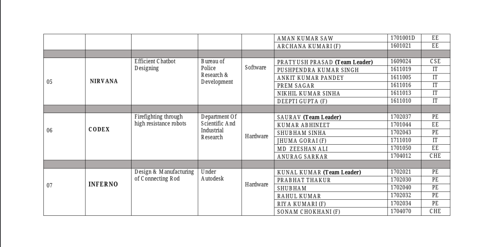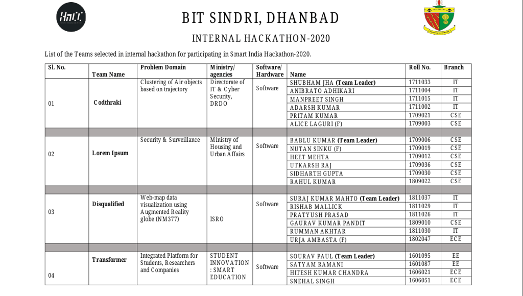 14 teams participated in the internal hackathon with their proposed solutions, out of which a total of 7 teams were selected for further rounds of SIH-2020. The details of the selected teams along with their problem statements is as follows –